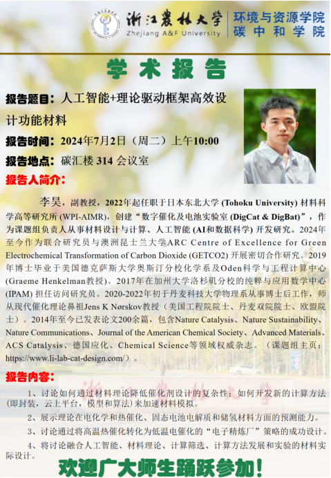 李昊,副教授,2022年起任职于日本东北大学 (Tohoku University) 材料科学高等研究所 (WPI-AIMR),创建“数字催化及电池实验室 (DigCat & DigBat)”,作为课题组负责人从事材料设计与计算、人工智能 (AI和数据科学) 开发研究。2024年至今作为联合研究员与澳洲昆士兰大学ARC Centre of Excellence for Green Electrochemical Transformation of Carbon Dioxide (GETCO2) 开展密切合作研究。2019年博士毕业于美国德克萨斯大学奥斯汀分校化学系及Oden科学与工程计算中心 (Graeme Henkelman教授)。2017年在加州大学洛杉矶分校的纯粹与应用数学中心 (IPAM) 担任访问研究员。2020-2022年初于丹麦科技大学物理系从事博士后工作,师从现代催化理论鼻祖Jens K Nørskov教授(美国工程院院士、丹麦双院院士、欧盟院士)。2014年至今已发表论文200余篇,包含Nature Catalysis、Nature Sustainability、Nature Communications、Journal of the American Chemical Society、Advanced Materials、ACS Catalysis、德国应化、Chemical Science等领域权威杂志。