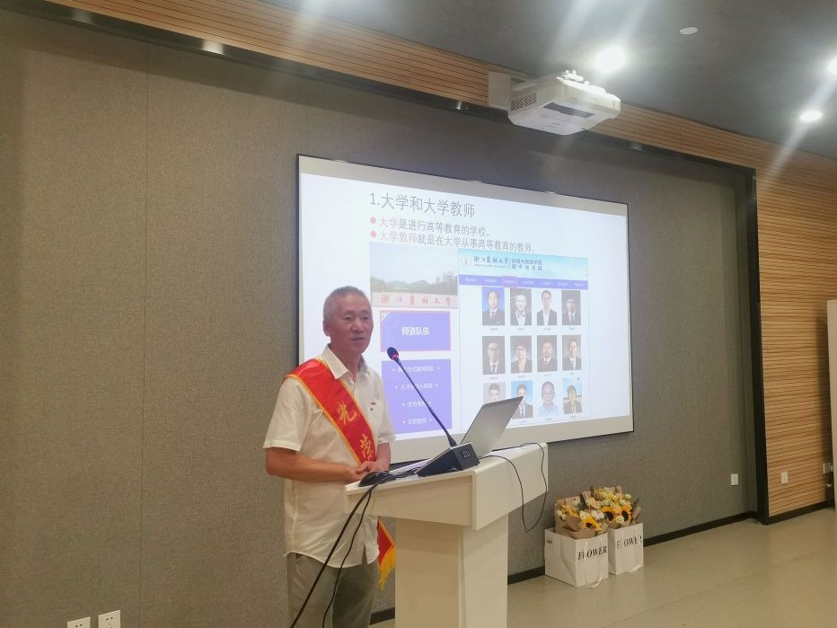活动还为汤孟平教授举行了“薪火传承,续写荣光”荣退仪式,侯锡铭书记与冯华军院长分别为汤老师批绶带、送鲜花。侯书记回顾了汤老师在漫长的教学科研生涯中所展现出的卓越师德和创新精神,并感谢汤老师对学校、学院的辛勤付出和卓越贡献。随后汤孟平教授还作了《怎样做一名大学教师》的报告,从教学、科研、社会服务以及三者如何紧密联系、相辅相成等几个方面,与各位新教师分享了自己从教34年来的心得体会。