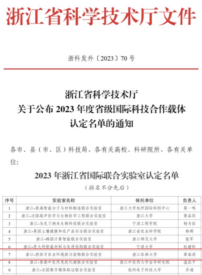 近日,浙江省科学技术厅下发了《浙江省科学技术厅关于公布2023年度省级国际科技合作载体认定名单的通知》(浙科发外〔2023〕70号),由环境科学与工程学科申报的“浙江—西班牙农业环境新污染物联合实验室”获得科技厅认定成为省级国际合作平台。