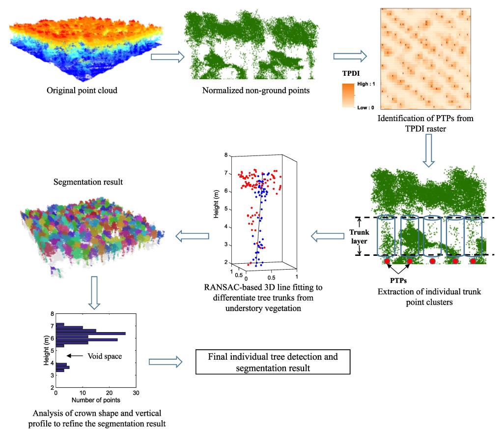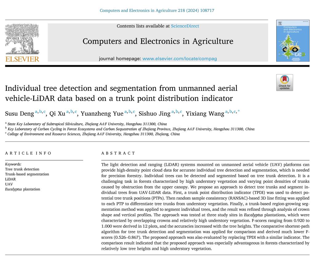 近日,环资院、碳中和学院森林碳汇团队完成的题为“Individual tree detection and segmentation from unmanned aerial vehicle-LiDAR data based on a trunk point distribution indicator”的论文,在国际权威学术期刊《Computers and Electronics in Agriculture》(中科院一区Top期刊,IF=8.3)上在线发表。