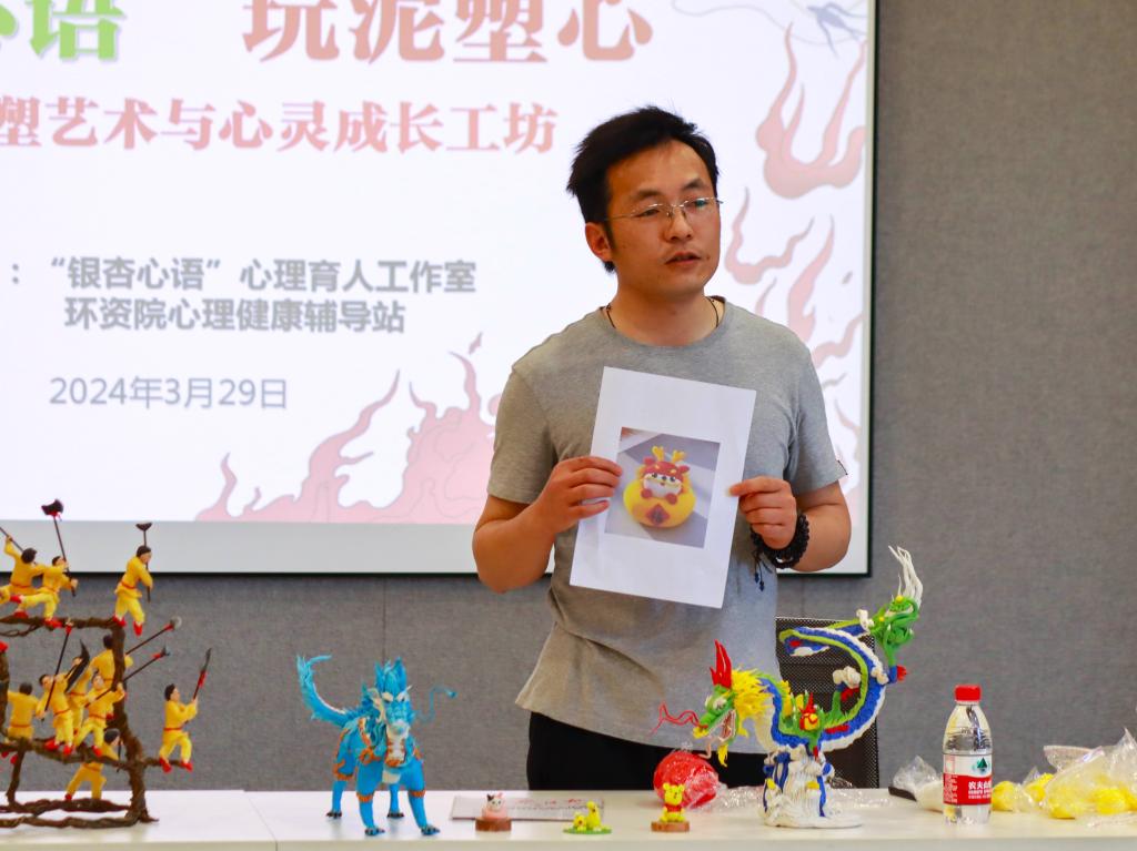 3月29日下午,一场别开生面的文化艺术与心理健康相结合的特色活动在活动中心举行。本次活动由“银杏心语”育人工作室联合环资院、碳中和学院心理健康辅导站共同主办,主题为“银杏心语·玩泥塑心—面塑艺术与心灵成长工坊”。