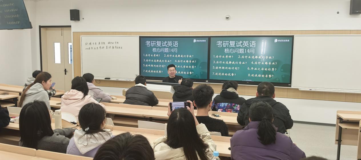 会上,指导老师结合近年调剂政策与典型案例,详细解读院校选择、材料提交、信息检索等实操要点,帮助同学们厘清面试逻辑、规避常见误区。针对复试环节,重点分析了英语听说能力的提升技巧和专业课笔试的应答策略,最后介绍了面试仪表管理方面的注意点,着重强调要在面试过程中展现良好心态与综合素质的重要性,鼓励积极与考官互动,展现自身的专业能力与优势。