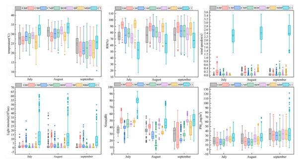 森林作为一种重要的自然资源,在调节气候、改善环境质量、提供心理舒适等方面具有显著的作用。然而,对于森林环境和结构与人体舒适度之间的关系,此前的研究仍不够系统。随着人们对生态环境的关注度不断提高,以及对森林康养、生态旅游等领域的兴趣日益浓厚,深入研究森林环境和结构对人体舒适度的影响显得尤为重要。本研究创新提出了森林气象环境舒适度指数(ForestMeteorology and Environment Comfort Index,F-MECI)模型,该模型在前人黄金分割法理论的基础上,通过费希纳定律将PM2.5、PM10、O3、光照和噪音等五个关键环境因子纳入到人体舒适度计算中,并将指数从“舒适”至“不适”细分为9个等级。这一方法解决了传统人体舒适度指数在森林环境中适用性不足的难题,为森林环境的舒适性评估提供了更具针对性的量化工具。