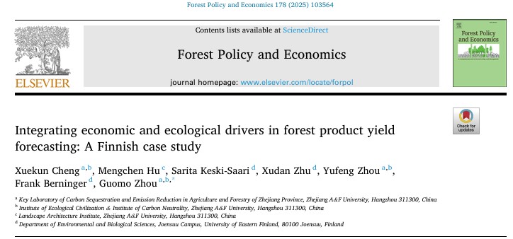 近日,环资院、碳中和学院周国模教授团队在国际权威农林科学期刊《Forest Policy and Economics》为SSCI,SCI双收录,(中科院1区TOP,影响因子IF=3.8)在线发表题为“Integrating economic and ecological drivers in forest product yield forecasting: A Finnish case study”(《在林产品产量预测中整合经济和生态驱动因素:芬兰案例研究》)的研究论文。William威廉官方为该论文第一单位和通讯作者单位。该团队博士研究生程学琨为第一作者,环资院、碳中和学院周国模教授为该论文的通讯作者,环资院、碳中和学院周宇峰、胡梦晨,东芬兰大学教授Frank Berninger和其团队学者Xudan Zhu、Sarita Keski-Saari共同参与了这项研究。