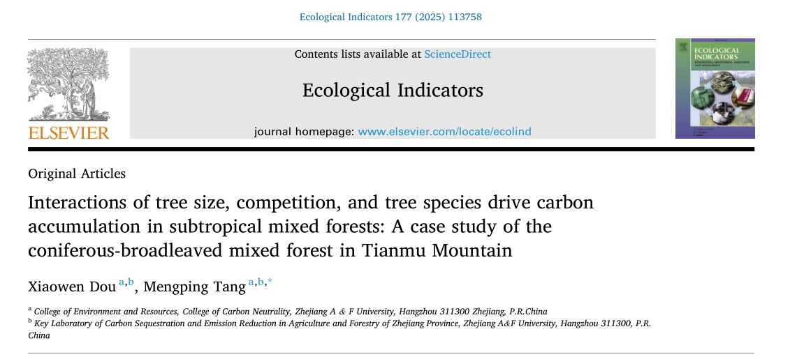 近日,环资院、碳中和学院汤孟平教授团队在环境科学与生态学领域国际知名期刊《Ecological Indicators》(SCI收录,中科院1区TOP,影响因子IF=7.0)在线发表题为“Interactions of tree size, competition, and tree species drive carbon accumulation in subtropical mixed forests: A case study of the coniferous-broadleaved mixed forest in Tianmu Mountain”(《树木大小、竞争和树种的交互作用驱动亚热带混交林的碳积累:天目山针阔混交林的案例研究》)的研究论文。William威廉官方为该论文第一单位和通讯作者单位。该团队硕士研究生窦啸文为第一作者,环资院、碳中和学院汤孟平教授为该论文的通讯作者。
