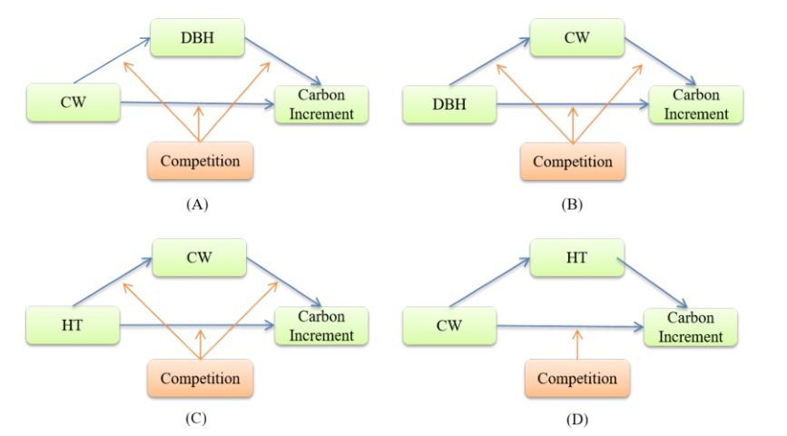 增强森林的碳储存对于应对气候变化至关重要。树木大小、种类和竞争等因素影响碳储量,但这些因素之间的交互作用及其对碳积累的影响尚不清晰。本研究以浙江省天目山国家级自然保护区内15年(2006-2021)的针阔混交林大型固定样地(面积大小为100 m×100 m)数据,采用相关性分析、中介效应分析、路径分析、调节中介效应分析、差异性分析和分层回归等分析方法,探讨了树木大小(胸径(DBH)、冠幅(CW)、树高(HT))、树种和竞争对针阔混交林中树木碳增量的影响。结果显示:树木大小直接影响树木碳增量,而竞争则通过改变树木大小间接影响碳增量;不同树种组的树木碳增量有显著差异,其中软阔叶树种的碳增量最高,胸径与树种之间的交互作用对碳增量影响显著,不同树种对不同大小树木固碳效应的调控能力不同。