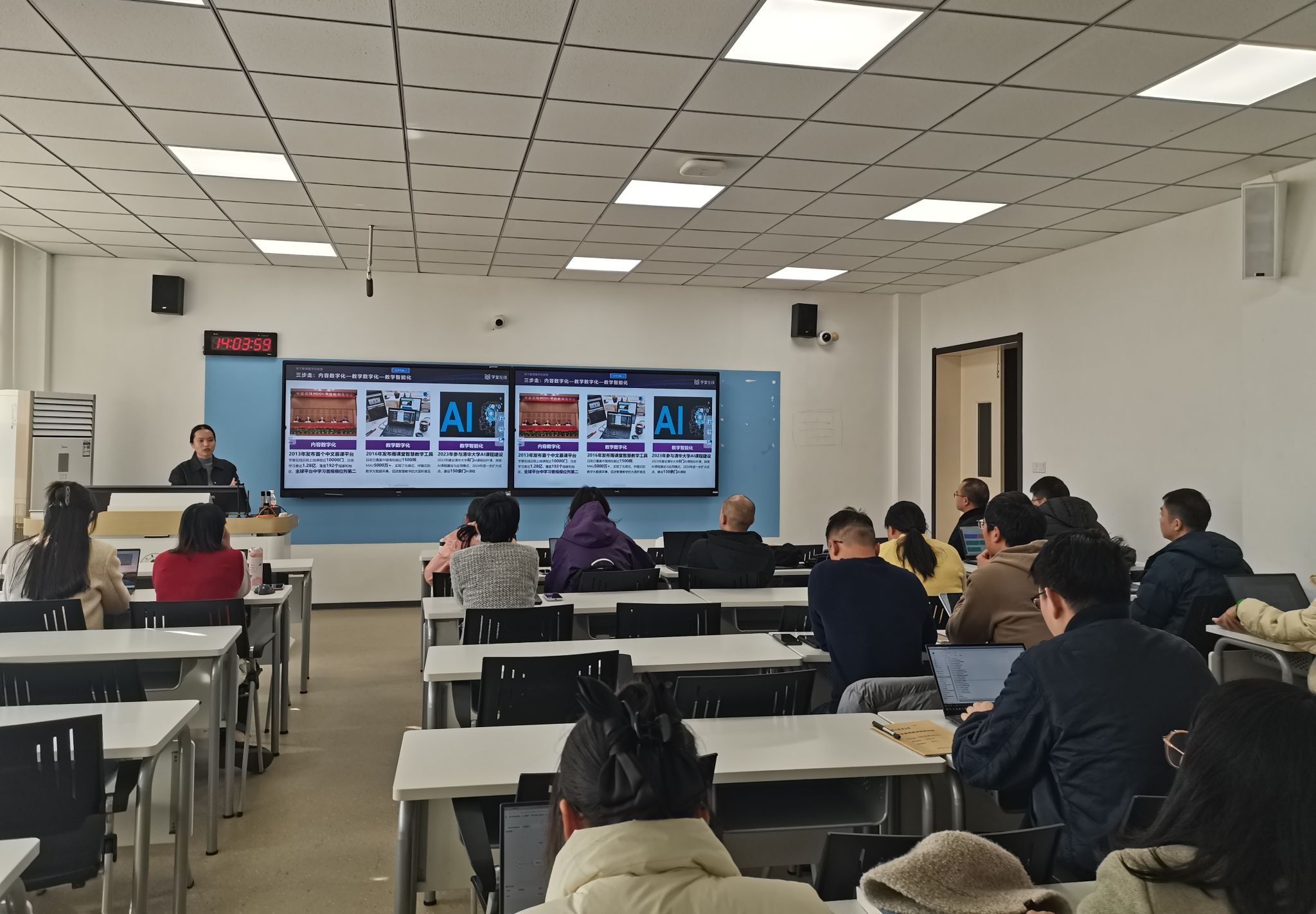 张利楠介绍了AI课程的定义、特点、功能,演示了AI课程平台架构过程,并现场指导教师建立AI课程,整个讲解与实操相结合,具有很强的指导性。