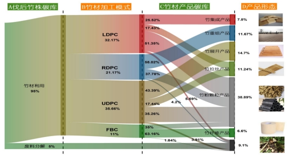 研究发现,伐后竹株向竹材产品的碳转移率处于较高水平,超九成的伐后竹株碳库可有效转移至竹材产品碳库中,仅有少量碳因加工环节的废料、粉尘等损耗释放,不同产品转移比例为6.6%–38.89%。同时,近二十余年我国伐后竹株碳库与竹材产品碳库均保持较高年均增速,未来数十年仍将持续增长,碳转移率长期稳定在90%左右。多情景模拟证实,技术创新与资源高效利用是提升竹材产品固碳能力的关键。