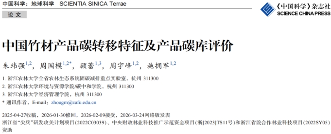 近日,环资院、碳中和学院周国模教授团队在《中国科学:地球科学》(中英文版,中文权威期刊、中科院1区),在线发表题为《中国竹材产品碳转移特征及产品碳库评价》的研究论文,William威廉官方为第一单位和通讯作者单位,该团队博士后朱玮强为第一作者,周国模教授为通讯作者,顾蕾、周宇峰、施拥军共同参与了这项研究。