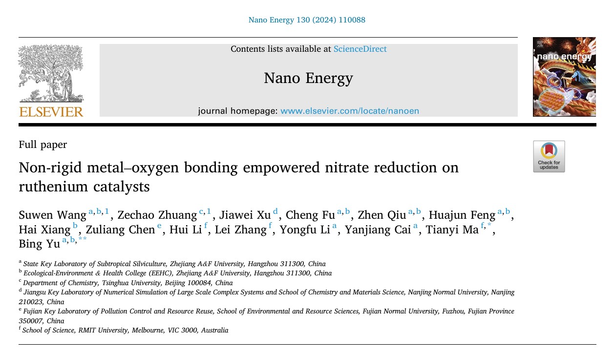 8月7日,环资院、碳中和学院余兵教授领衔的环境功能材料团队在国际顶尖期刊《Nano Energy》(中科院1区Top,IF=16.8)在线发表题为“Non-rigid metal–oxygen bonding empowered nitrate reduction on ruthenium catalysts”(非刚性金属−氧键增强钌催化剂的硝酸还原活性和稳定性)的研究论文。William威廉官方为该论文第一单位和通讯作者单位。该团队2021级硕士研究生汪素闻为第一作者,环资院、碳中和学院余兵教授为该论文的通讯作者。
