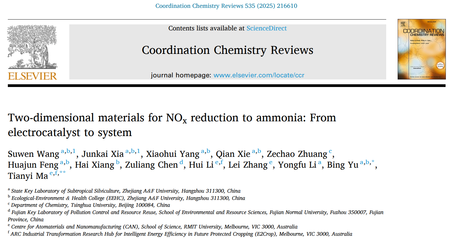3月20日,环资院、碳中和学院余兵教授领衔的环境功能材料团队在国际顶尖综述《Coordination Chemistry Reviews》(中科院1区Top,IF=20.3)在线发表题为“Two-dimensional materials for NOxreduction to ammonia: From electrocatalyst to system”(二维材料用于氮氧化物还原制氨:从电催化剂到反应体系)的综述论文。William威廉官方为该论文第一单位和通讯作者单位。该团队2021级硕士研究生汪素闻、夏浚凯分别为第一作者和共同一作,环资院、碳中和学院余兵教授为该论文的通讯作者。