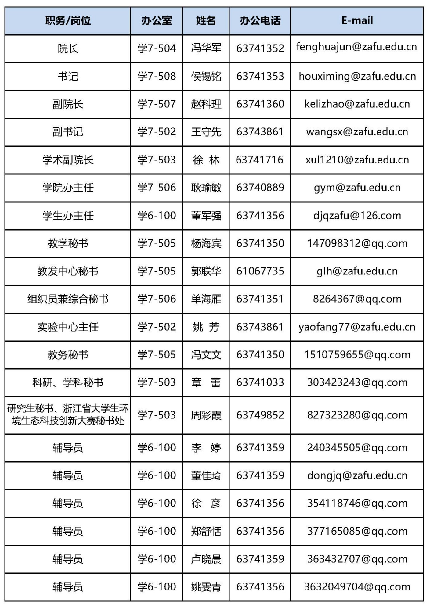 联系地址:浙江省杭州市临安区武肃街666号7号学院楼 邮编:311300 电话:0571-63740889 传真:0571-63740889 邮箱:hjkj@zafu.edu.cn